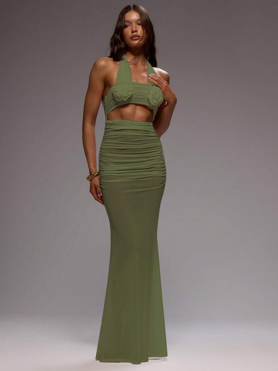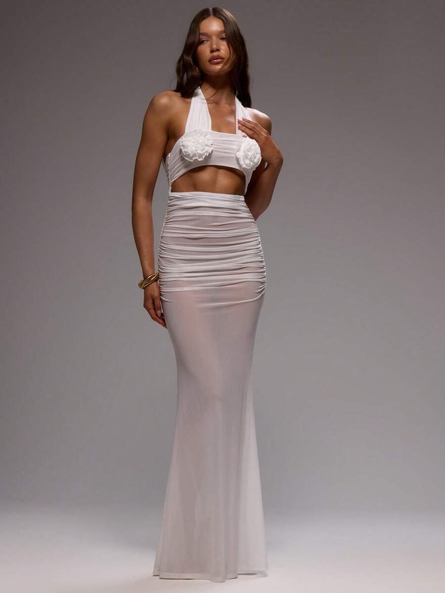 Elegant Mesh Floral Patched Halter Neck Maxi Dress For Vacation Summer Bridal Bachelorette Hen Do Wedding