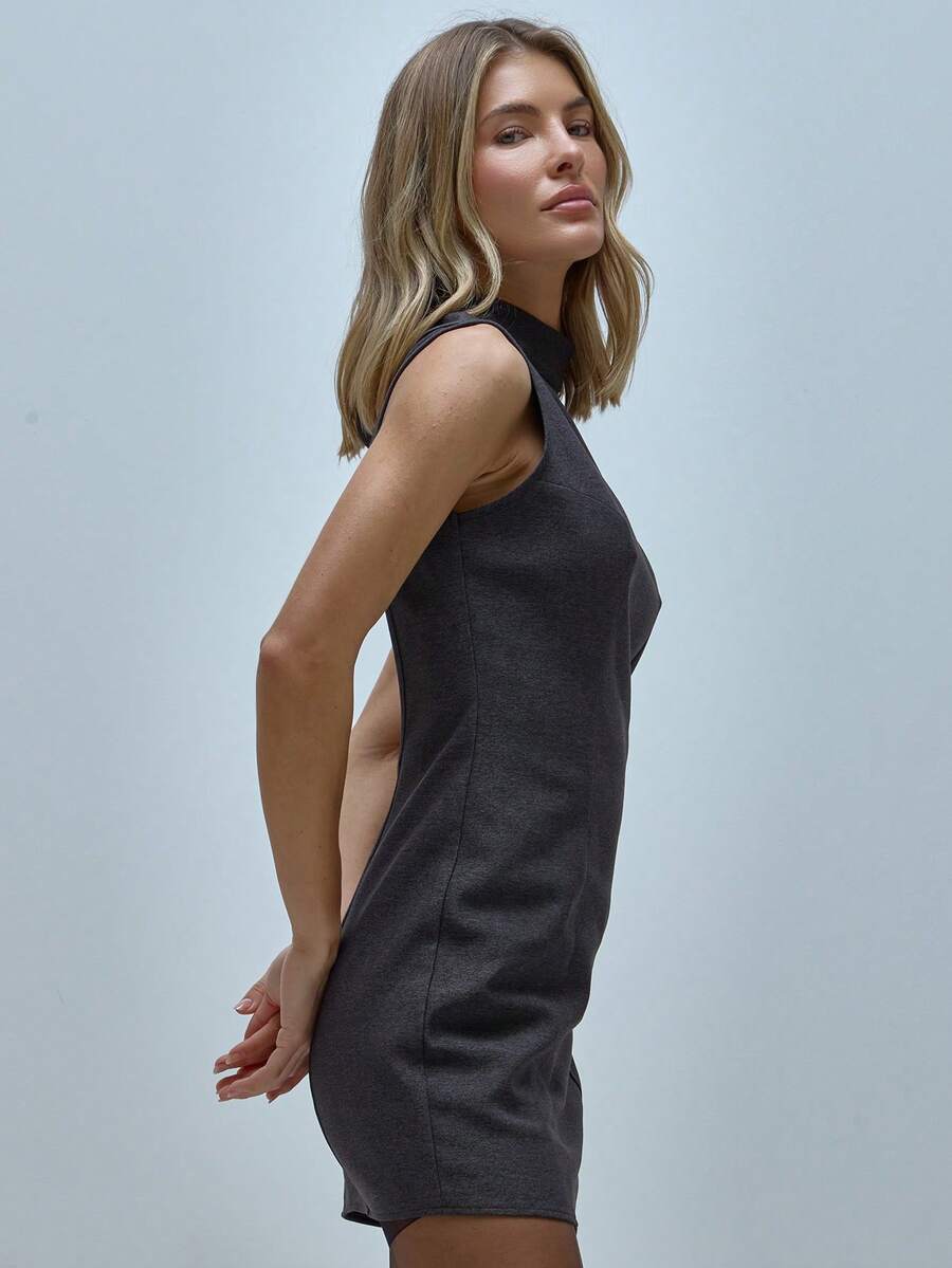High Funnel Neck Open Cut Out Back Suited Seam Detail Mini Dress