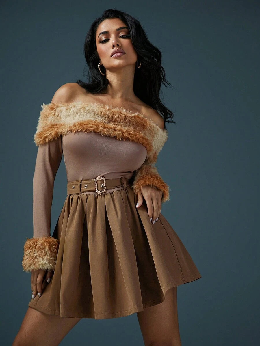 Women Furry Patchwork Off Shoulder Minimalist Mini Dress