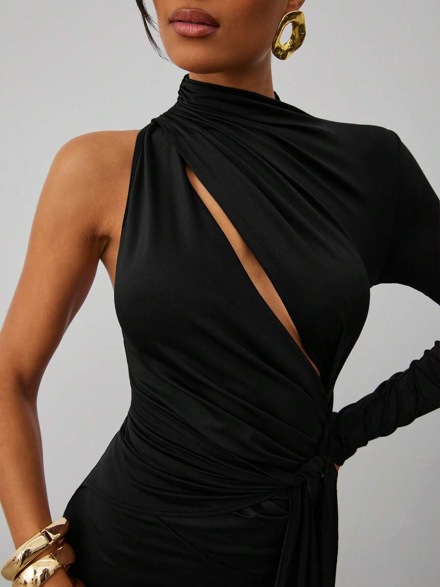 Sexy Casual High Neck Asymmetrical One Shoulder Cut Out Sash Mini Dress