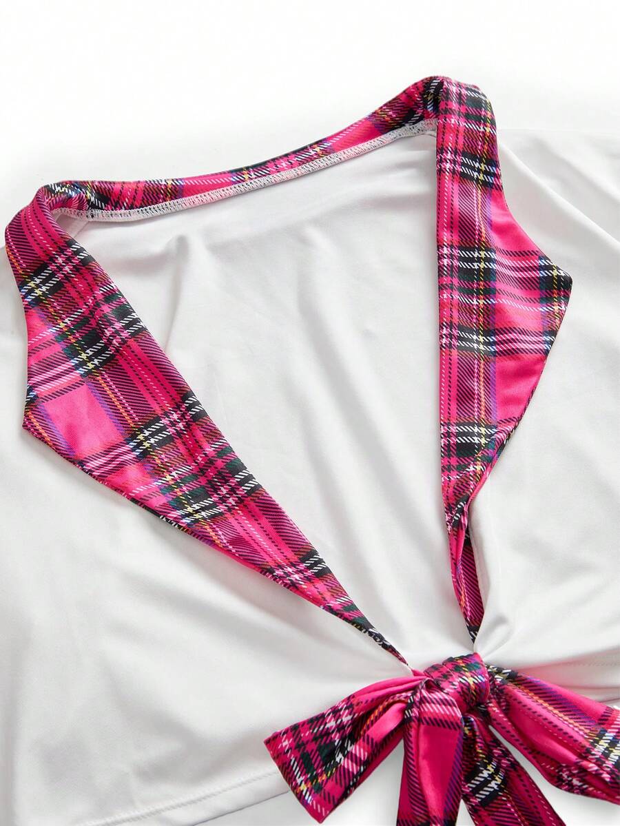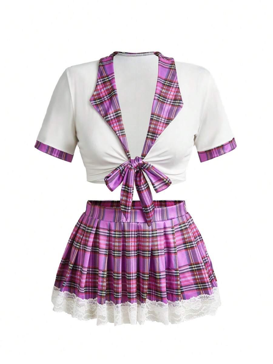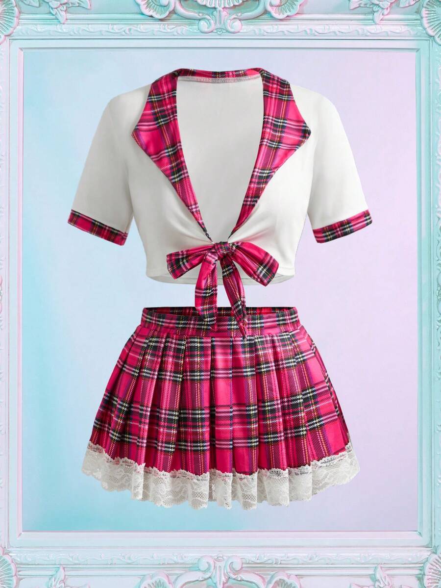 3pcs Women's Emotional Lingerie Set, Plaid Print Tie Front Lace Trim Cosplay Bra And Panty Set (Wireless, G-String, Skirt)