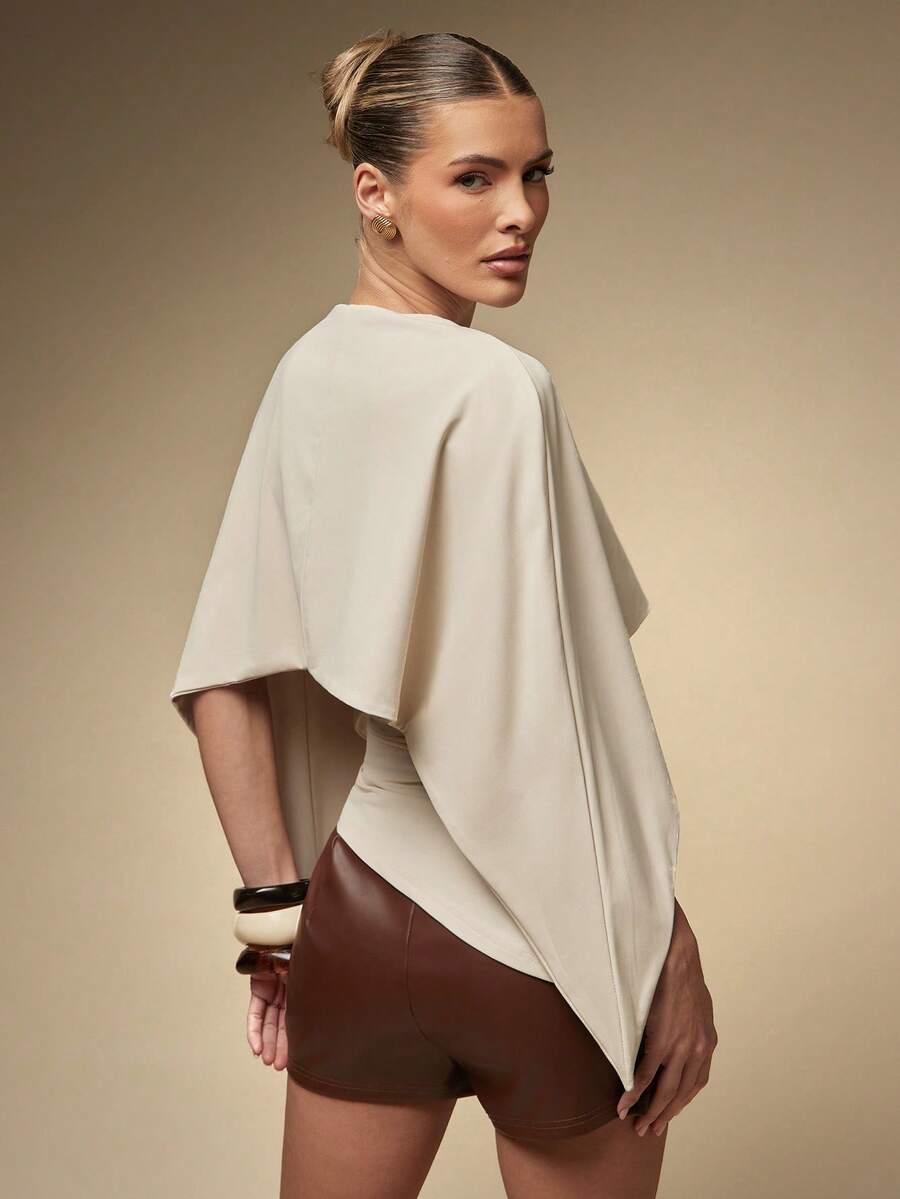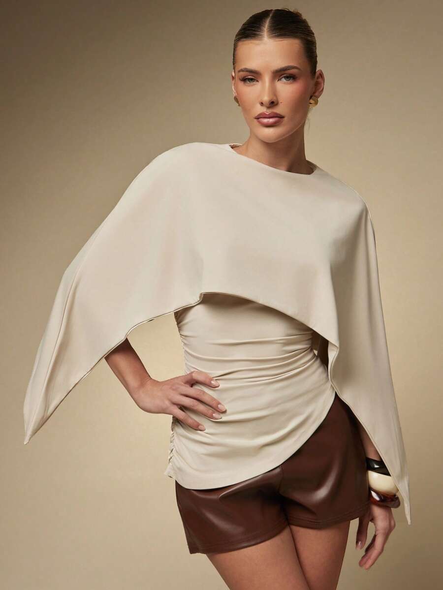 Women's Sexy Asymmetric Hem Ruched Detail Woven Cape Top