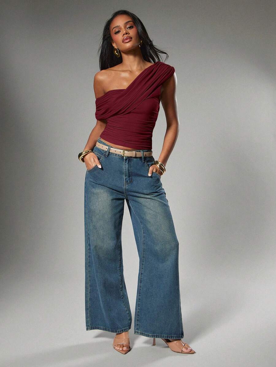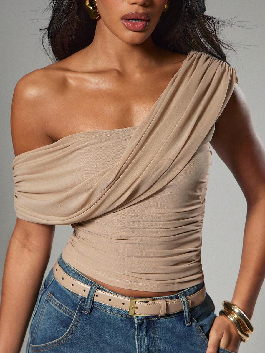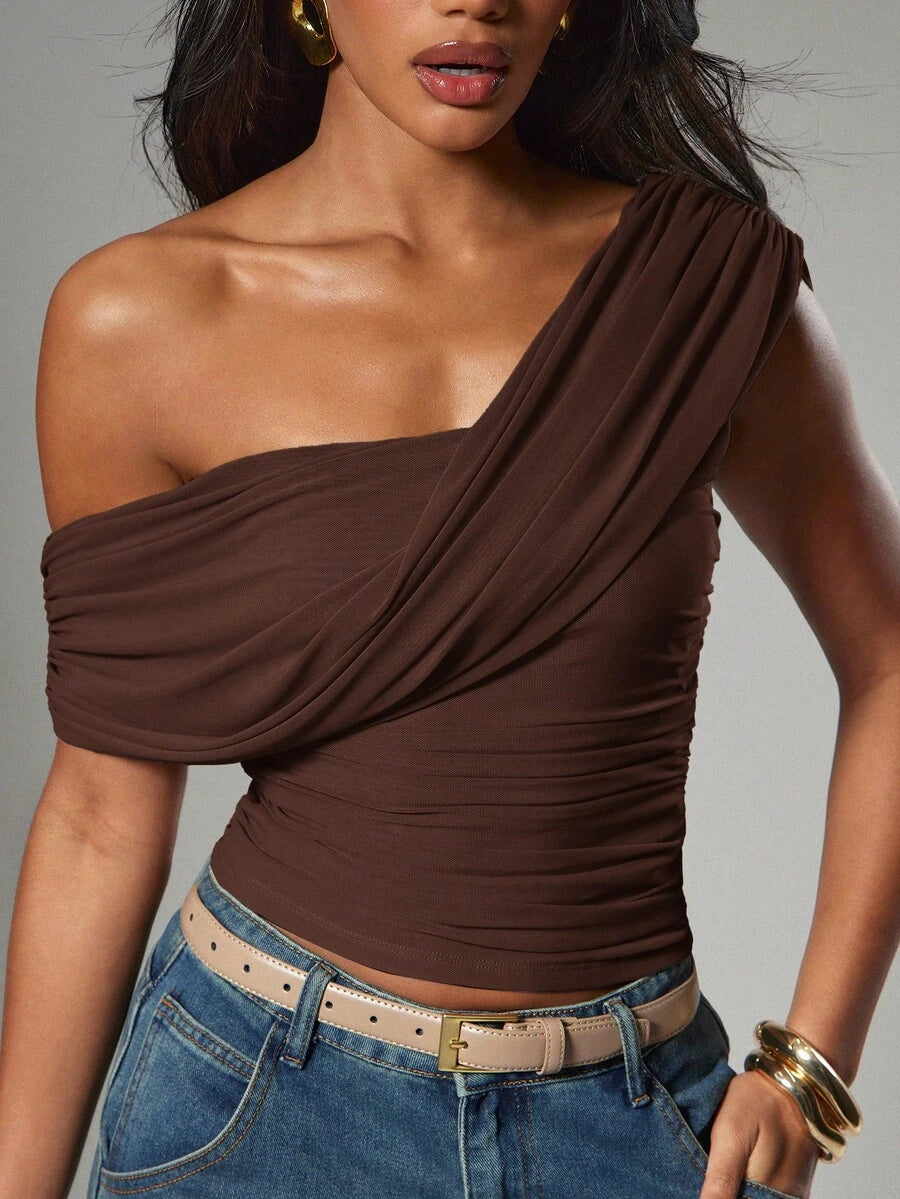 Women's Sexy Casual Solid Color Asymmetrical One Shoulder Ruched Top