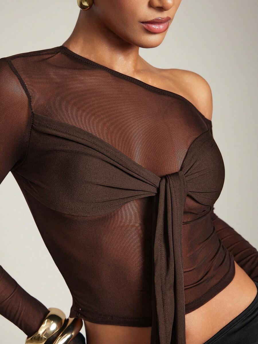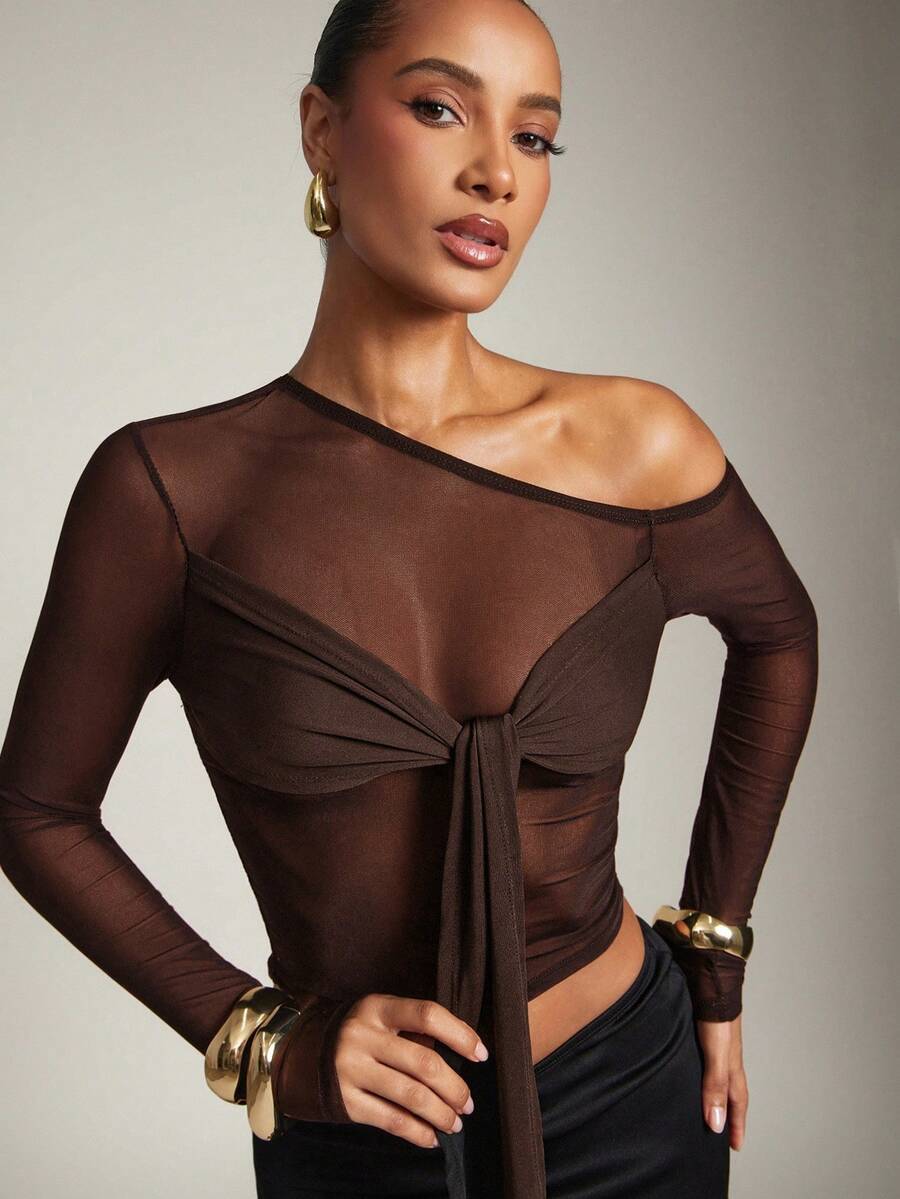 Details: Asymmetrical. Details: Knot. Details: Sheer. Body: Unlined. Neckline: Asymmetrical Neck. Pattern Type: Plain. Sleeve Type: Regular Sleeve. Style: Sexy. Occasion: Night Out. Occasion: Homecoming. Hem Shaped: Slit. Lined For Added Warmth: No. Festivals: Halloween. Color: Brown. Sleeve Length: Long Sleeve. Length: Crop. Fit Type: Slim Fit. Sheer: No. Fabric Elasticity: High Stretch. Material: Mesh Fabric. Composition: 94% Polyamide, 6% Elastane. Care Instructions: Hand wash or professional dry clean.