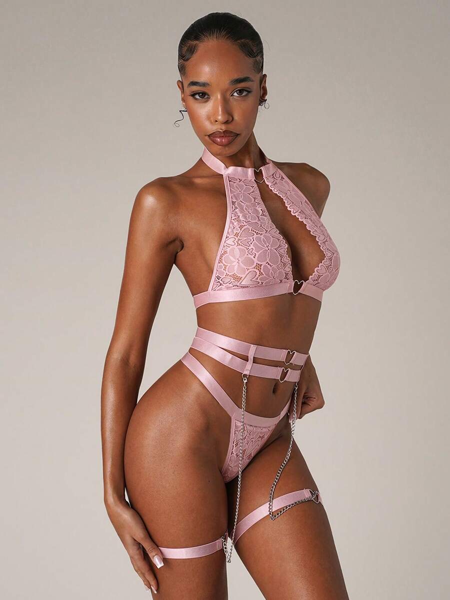 Details: Contrast Lace. Details: Cut Out. Details: Backless. Details: Chain. Details: Ring. Pattern Type: Plain. Wires: Wireless. Straps Type: Adjustable Straps. Color: Baby Pink. Neckline: Halter. Bra Type: Bralettes. Type: Sexy Sets. Panty Type: V-strings. Rise: Mid Rise. Number of Pieces: 5 Piece Set. Underwear & Sleepwear Users: Couple. Festivals: Valentine's Day. Scenes: Private Party. Care Instructions: Hand wash or professional dry clean. Fabric Elasticity: Slight Stretch. Sheer: Yes. Tops & Pants Composition: 95% Polyester, 5% Elastane. Tops Material: Fabric.